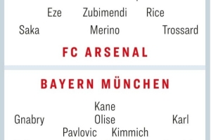 體育資訊11月24日訊 拜仁和阿森納在本輪聯(lián)賽各自取得大勝,兩隊(duì)也將在周中迎來歐冠榜首之爭,拜仁作客挑戰(zhàn)阿森納。《踢球者》也預(yù)測了雙方首發(fā):
