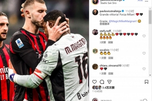 帕夫洛維奇社媒曬出親吻邁尼昂的照片,配文:“偉大的勝利,加油米蘭!謝謝你,邁尼昂。”