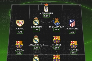 體育資訊11月25日訊 西甲聯(lián)賽第13輪已經(jīng)完賽,whoscored也列出了本輪西甲評分最佳陣容,巴薩4將、皇馬3人在列。