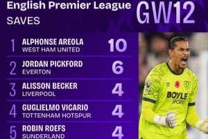 與此同時,西漢姆門將阿雷奧拉則單場完成10次撲救,幫助西漢姆戰(zhàn)平伯恩茅斯。這也創(chuàng)下了本賽季英超門將的單場撲救紀錄。