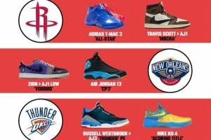 對(duì)陣火箭可能會(huì)穿麥迪球鞋還有倒鉤(特拉維斯·斯科特是德州人)、對(duì)鵜鶘穿錫安的PE和保羅的PE、對(duì)雷霆?jiǎng)t是威少的PE和杜蘭特的KD 4、對(duì)76人則可能穿艾弗森的球鞋和伊戈達(dá)拉當(dāng)年的PE。