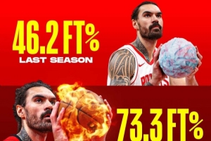 亞當(dāng)斯上賽季罰球命中率46.2%,本賽季73.3%,進(jìn)步幅度58.66%(46.2%×58.66%+46.2%=73.3%);生涯罰球命中率為53.3%