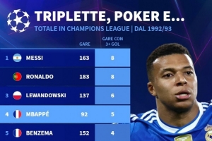 歐冠改制以來單場進(jìn)球3+場次榜: