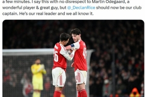 阿森納擁躉摩根在社媒曬出賴斯本場戴上隊(duì)長袖標(biāo)的照片,寫道:“賴斯昨晚比賽中首次戴上阿森納隊(duì)長袖標(biāo),盡管只有幾分鐘。我這么說并不是出于對厄德高的不敬,他也是一名出色的球員、很棒的伙計(jì),但是賴斯現(xiàn)在應(yīng)該成為球隊(duì)隊(duì)長了,他是我們真正的領(lǐng)袖,這我們都知道的。”