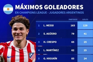 體育資訊11月28日訊 德國轉會市場統(tǒng)計了阿根廷球員在歐冠比賽中的進球數量,并列出榜單,梅西129球居首,阿圭羅次席,阿爾瓦雷斯18球第9。