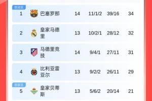 最新積分榜方面:先賽的巴薩憑借2分優(yōu)勢(shì)暫升榜首,排名第2的皇馬明日凌晨將客戰(zhàn)赫羅納,同樣先賽的馬競積分反超黃潛暫時(shí)來到第3。