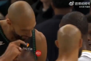 賽后發(fā)生有趣一幕,戈貝爾指著自己的腦門,對(duì)杰倫·布朗面授機(jī)宜,大致意思是別整發(fā)際線粉了,像我這樣多好。有趣的是,在這過(guò)程中另一個(gè)大光頭德里克·懷特從他倆身前走過(guò)。