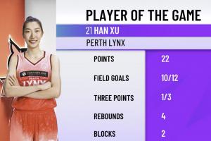 韓旭此役完成WNBL首秀,出戰(zhàn)28分鐘41秒,兩分9中9,三分3中1,罰球2中1,砍下并列全隊(duì)最高的22分,另外有4籃板2蓋帽。
