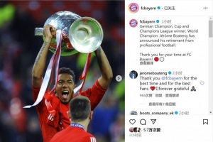 拜仁官方社媒曬出博阿滕效力球隊(duì)期間捧起歐冠獎(jiǎng)杯的照片,并寫道:“德甲冠軍、德國(guó)杯冠軍、歐冠冠軍、世界冠軍,博阿滕已經(jīng)宣布退役。感謝你在拜仁的時(shí)光!”
