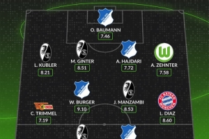 中場:克里斯托弗·特里梅爾(柏林聯(lián),7.19分)、沃特·伯格(霍芬海姆,9.10分)、約翰·曼贊比(弗賴堡,8.53分)、路易斯·迪亞斯(拜仁,8.60分)