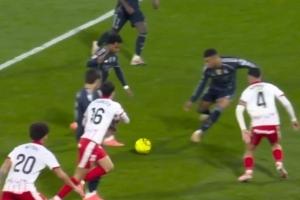 西甲第14輪,皇馬客場1-1戰(zhàn)平赫羅納,讀秒階段皇馬獲得絕殺機(jī)會,貝林厄姆禁區(qū)橫敲,正對球門的羅德里戈調(diào)整步點(diǎn)準(zhǔn)備射門,這時正對來球但側(cè)對球門的姆巴佩半路殺出,轉(zhuǎn)身兜射打偏。