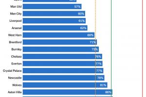 布萊頓以49%的比例表現(xiàn)最佳,財(cái)務(wù)狀況最為健康,熱刺和曼聯(lián)緊隨其后。然而,不少俱樂部面臨合規(guī)壓力,維拉、諾丁漢森林等隊(duì)已超過歐足聯(lián)設(shè)定的限制線,而伯恩茅斯更是以104%的比例高居榜首,甚至突破了英超聯(lián)賽設(shè)定的“綠色”安全閾值,顯示出較高的財(cái)政風(fēng)險(xiǎn)。