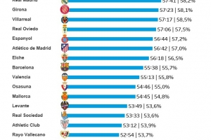 體育資訊12月2日訊 Opta統(tǒng)計了本賽季西甲各隊的場均凈比賽時間,并列出榜單,皇馬排名第三位。