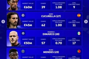 庫(kù)庫(kù)雷利亞(切爾西,27歲,西班牙):身價(jià)4500萬(wàn)歐,62場(chǎng),場(chǎng)均丟1.00球,直接參與11球