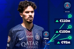 體育資訊12月3日訊 德國轉會市場預熱巴黎中場維蒂尼亞的身價變化,這位葡萄牙球員的身價確定上漲,最高可能達到1.1億歐元。