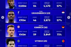 維蒂尼亞(巴黎,25歲,葡萄牙):身價(jià)9000萬歐,68場(chǎng),5373分鐘,勝率78%