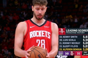 他也是火箭隊(duì)史第23個(gè)得分破5000的球員。