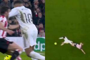 西甲第19輪,皇馬3-0客勝畢爾巴鄂競技,姆巴佩2射1傳。其中第一球,姆巴佩接到阿諾德的長傳,卸球轉(zhuǎn)身擺脫左后衛(wèi)萊奎、帶球推進、弧頂變向過掉中衛(wèi)拉波爾特、射門得分,這個過程一氣呵成,萊奎防守姆巴佩時上手拉、下腳鏟都沒攔住!