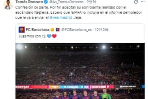 而阿斯報(bào)副主編,也是知名皇馬球迷的龍賽羅在社媒轉(zhuǎn)發(fā)了巴薩官方的這則動(dòng)態(tài),并表示:“當(dāng)事人自己招供了,終于承認(rèn)了內(nèi)格雷拉丑聞那令人臉紅的事實(shí)。希望皇馬把這事寫進(jìn)即將發(fā)給FIFA的那份“毀滅性報(bào)告”里面。呵呵。”