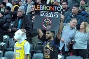 賽前有身穿詹姆斯球衣的球迷打出了“永遠(yuǎn)的勒布倫多(LeBronto,勒布朗和多倫多組合的諧音寓意詹姆斯生涯對(duì)猛龍的統(tǒng)治力)”的標(biāo)語(yǔ),另一位詹姆斯球迷則戴上了山羊頭套。