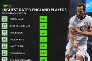體育資訊12月5日訊 WhoScored統(tǒng)計(jì)了本賽季英格蘭球員的聯(lián)賽場(chǎng)均評(píng)分,并列出榜單,凱恩居首,貝林厄姆、福登分列二三位。