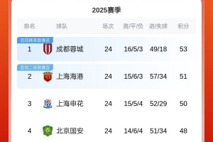 目前成都蓉城積53分居榜首,上海海港積51分位列次席,上海申花積50分排第三,北京國(guó)安積48分排第四。
