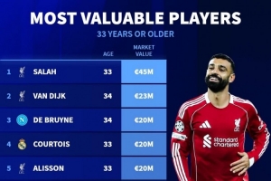 體育資訊12月7日訊 德國(guó)轉(zhuǎn)會(huì)市場(chǎng)統(tǒng)計(jì)了年齡33+球員的身價(jià),并列出榜單,薩拉赫4500萬(wàn)歐居首,梅西1800萬(wàn)歐第七。