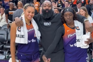 本場比賽,快船球星詹姆斯-哈登現(xiàn)身場邊觀戰(zhàn),賽后他還與水星球員薩巴利和庫珀擁抱慶祝。