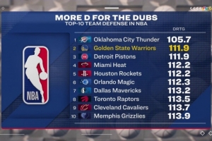 過去三場比賽勇士失分是99/94/91;目前他們防守效率111.9,聯(lián)盟第二僅次于雷霆。