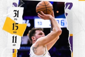 賽后,湖人官推發(fā)布東契奇數(shù)據(jù)海報:又一場三雙表現(xiàn)??