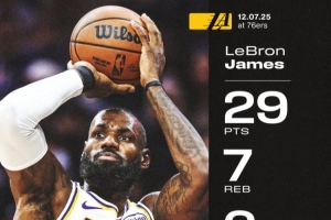 本場(chǎng)比賽,湖人前鋒詹姆斯上場(chǎng)34分鐘,17投12中得到29分7籃板6助攻。