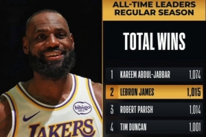 詹姆斯收獲了他生涯第1015場常規(guī)賽勝利,高居歷史第二,而他距離歷史紀錄保持者賈巴爾(1074)還差60勝。