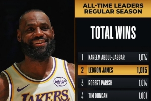 本場(chǎng)勝利是詹姆斯生涯中的第1015勝,他超越了羅伯特·帕里什,升至NBA球員歷史勝場(chǎng)第二(僅次于賈巴爾的1074勝)。