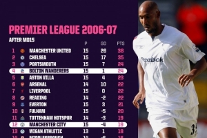 opta列出上一次英超聯(lián)賽第15輪結(jié)束后,第4和第12之間的積分差距不超過5分時的積分榜。06-07賽季英超15輪過后,第4博爾頓24分,第12曼城19分,兩隊相差5分。
