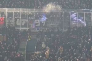 法蘭克福球迷還兩次向巴薩球迷所在的看臺(tái)投擲煙火。