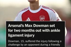 據(jù)奧恩斯坦的報(bào)道,這名15歲的小將是在周六對(duì)陣曼聯(lián)的友誼賽中,被對(duì)方球員鏟搶時(shí)受傷的。他的傷勢(shì)預(yù)計(jì)無(wú)需通過(guò)手術(shù)進(jìn)行治療。