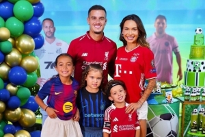 庫(kù)蒂尼奧為兒子慶祝勝利,一家人身穿國(guó)米、利物浦、巴薩和拜仁的球衣,這都是庫(kù)蒂尼奧在歐洲效力過(guò)的俱樂(lè)部。