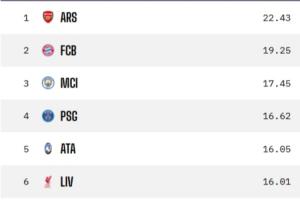 前8名預(yù)測(cè)與目前積分榜前8名沒(méi)有太大變化,機(jī)構(gòu)認(rèn)為利物浦最后兩輪將闖入前8,取代國(guó)米直接晉級(jí)。