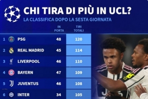 體育資訊12月11日訊 德國轉會市場統(tǒng)計了本賽季歐冠各隊的射門次數(shù),并列出榜單,巴黎120次射門居首,皇馬、利物浦二三位。