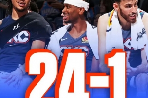 雷霆49分擊潰太陽,隊史最高16連勝,24勝1負(fù)開局——輸?shù)哪菆鍪潜晨勘常瑏啔v山大帶哈騰和三替補(bǔ)。