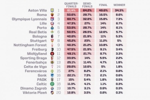 體育資訊12月12日訊 opta在當(dāng)?shù)貢r(shí)間12月11日對(duì)本賽季歐聯(lián)杯形勢進(jìn)行了新的預(yù)測,阿斯頓維拉奪冠概率達(dá)到34.3%,羅馬8.6%第二。
