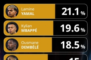 體育資訊12月12日訊 環(huán)球足球獎(jiǎng)公布了年度最佳前鋒的投票情況,亞馬爾21.1%領(lǐng)跑。
