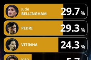 體育資訊12月12日訊 環(huán)球足球獎(jiǎng)公布了年度最佳中場(chǎng)的投票情況,貝林厄姆居首,佩德里次席。