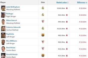 體育資訊12月12日訊 德轉(zhuǎn)更新西甲身價(jià),跌幅排行中,貝林厄姆、羅德里戈和桑塞特下跌2000萬(wàn)歐最多。