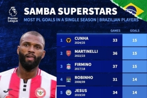 體育資訊12月13日訊 巴西球員英超單賽季進(jìn)球排行榜出爐,24/25賽季庫尼亞33場15球排名第1,本賽季伊戈?duì)枴さ賮喐?5場11球暫居第13。