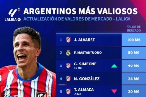 體育資訊12月13日訊 德國轉會市場更新了西甲球員的身價,并列出西甲阿根廷球員身價排名,阿爾瓦雷斯1億歐居首,馬斯坦托諾5000萬歐次席。