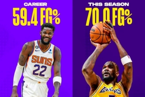 他有望成為隊(duì)史首位單賽季場(chǎng)均得分超過(guò)15分且命中率超過(guò)70%的球員,展現(xiàn)出在內(nèi)線的絕對(duì)統(tǒng)治力、高效性和掌控力。