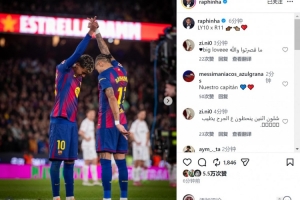 拉菲尼亞賽后更新社媒動態(tài),曬出與亞馬爾慶祝進(jìn)球的合照,配文:“LY10 x R11??????????”