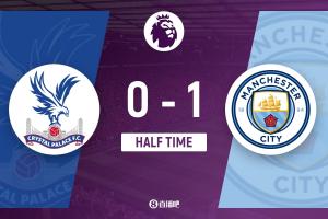 上半場傷停補時3分鐘,半場結束,曼城暫1-0水晶宮。