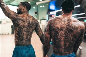 小佩頓有一整幅非常復(fù)雜的背部紋身,核心是一個(gè)巨大的美杜莎頭像,兩側(cè)肩膀分別加入了致敬伏地魔和戴維·瓊斯的元素。
